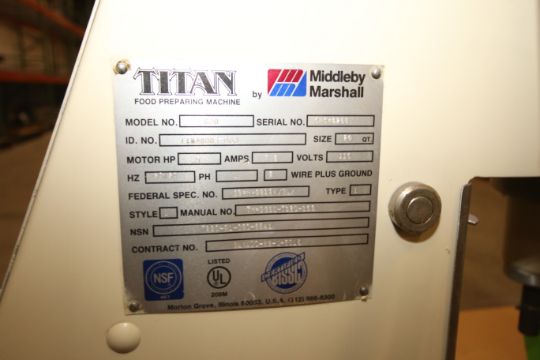 Middleby Marshall Titan 20 Qt. Mixer, Model 620, S/N CRS-6255 with .5 hp Motor, 115 V includes (2) Flat Beaters, (2) Whips and (2) Dough Hood Attachments