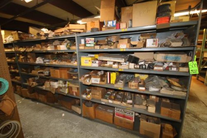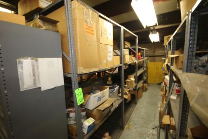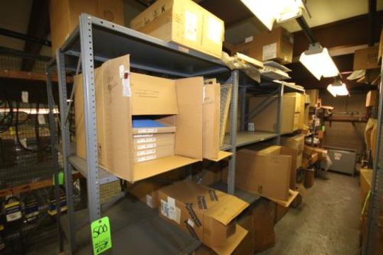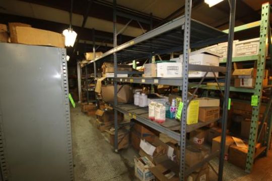 9-Sections of Shelving with Contents, Contents Includes, Print Cartridges, Gate Valve Lock Outs, Duck Tape, Powdered Cleaner, Flex Hoses, NEW Door Knobs, Sprockets, Oil Seals, Filters, Hardware, Edge Protectors, Other Present Contents