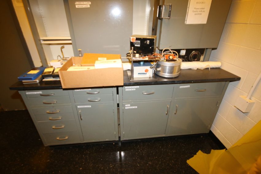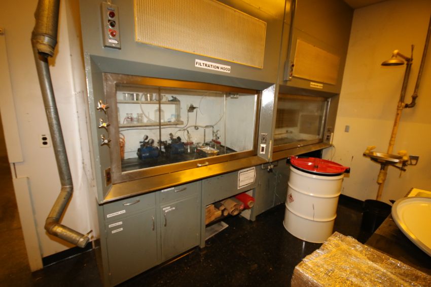 { Choice of lots: 678, 679, 680 } Lab Cabinets with Acid Resistant Tops Throughout Room 3 includes (1) 10 ft. L x 34" W; (1) 86" L x 3 ft. W; (1) 6 ft. L x 36" W Center Island and (2) Fume Hoods with Cabinet (NOTE: Contents Not Included)