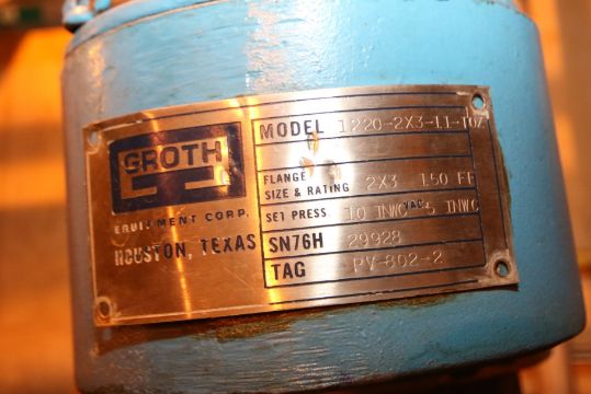 { Group of lots: 42, 45, 47, 60, 61, 62, 65, 66, 67, 68, 69, 70, 71, 72, 73, 73A, 73B, 75, 77, 79, 80, 81, 82, 83, 84, 85, 86, 97, 98, 99, 100, 101, 102, 103, 104, 105, 106, 107, 108, 109, 110, 111, 112, 113, 118, 119, 121, 134, 135, 136, 149, 151, 152, 164, 165, 200, 201, 202, 203, 212, 213, 214, 215, 216, 217, 218, 219, 220, 221, 222, 223, 246, 247, 248, 256, 257, 258, 260, 261, 263B, 267, 268, 270A, 271, 272, 273, 274, 275, 276, 277, 278, 279, 280, 281, 282, 283, 285, 286, 287, 288, 289, 290, 291, 292, 293, 294, 295, 296, 297, 301, 302, 303, 304, 307, 308, 309, 309A, 309B, 310, 310A, 314, 315, 316, 317, 319, 327, 328, 329, 344, 352, 355, 356, 357, 358, 361, 363A, 363B, 364, 443, 444, 445, 461, 462, 463, 464, 465, 466, 467, 468, 469, 610, 637, 638, 819, 819A, 820, 823, 824, 825, 826, 827, 828, 830, 831, 832, 833, 834, 835, 836, 837, 838, 839, 840, 841, 842, 843, 846, 846B, 847, 848, 849, 851, 856, 857, 858, 859, 861, 862, 863, 864, 865, 866, 870, 871, 873, 874, 875, 876, 877 } Groth Inline Pressure Relief Valve/Vent System, Model 1220-2X3-11-T0Z, S/N 76H 29928 with Flange 2” x 3”, 150 FF