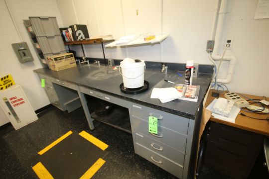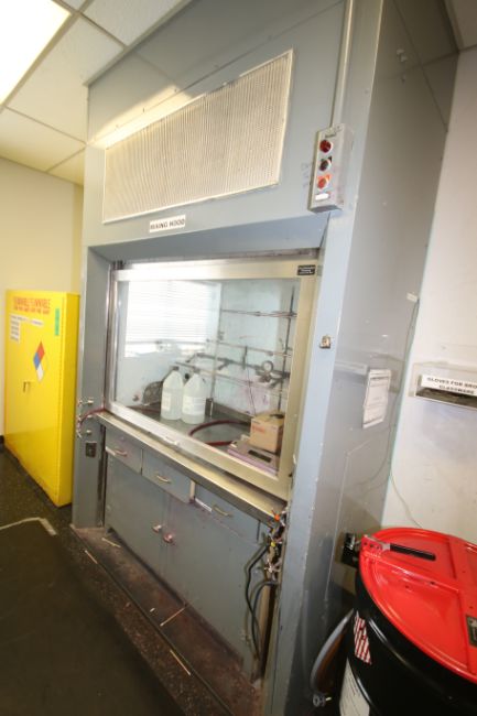 { Choice of lots: 678, 679, 680 } Lab Cabinets with Acid Resistant Tops Throughout Room 1 includes (1) 10 ft. L x 34" W Cabinet; (1) 17 ft. 10" L x 62" W Center Island and (4) Fume Hoods with Cabinets (NOTE: Contents Not Included)