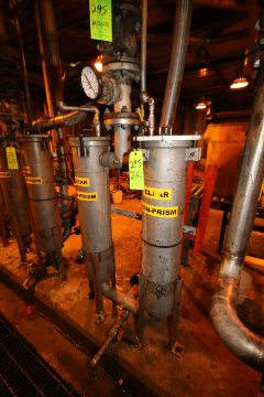 { Group of lots: 42, 45, 47, 60, 61, 62, 65, 66, 67, 68, 69, 70, 71, 72, 73, 73A, 73B, 75, 77, 79, 80, 81, 82, 83, 84, 85, 86, 97, 98, 99, 100, 101, 102, 103, 104, 105, 106, 107, 108, 109, 110, 111, 112, 113, 118, 119, 121, 134, 135, 136, 149, 151, 152, 164, 165, 200, 201, 202, 203, 212, 213, 214, 215, 216, 217, 218, 219, 220, 221, 222, 223, 246, 247, 248, 256, 257, 258, 260, 261, 263B, 267, 268, 270A, 271, 272, 273, 274, 275, 276, 277, 278, 279, 280, 281, 282, 283, 285, 286, 287, 288, 289, 290, 291, 292, 293, 294, 295, 296, 297, 301, 302, 303, 304, 307, 308, 309, 309A, 309B, 310, 310A, 314, 315, 316, 317, 319, 327, 328, 329, 344, 352, 355, 356, 357, 358, 361, 363A, 363B, 364, 443, 444, 445, 461, 462, 463, 464, 465, 466, 467, 468, 469, 610, 637, 638, 819, 819A, 820, 823, 824, 825, 826, 827, 828, 830, 831, 832, 833, 834, 835, 836, 837, 838, 839, 840, 841, 842, 843, 846, 846B, 847, 848, 849, 851, 856, 857, 858, 859, 861, 862, 863, 864, 865, 866, 870, 871, 873, 874, 875, 876, 877 } Imperial Aprox. 38” H x 8” W Inline Filters, S/N 196, MAWP 150 psi @ 500 Degree F with 3” x 3” Connectors and Durco Ball Valve (Located 1st Floor Polymers Building)