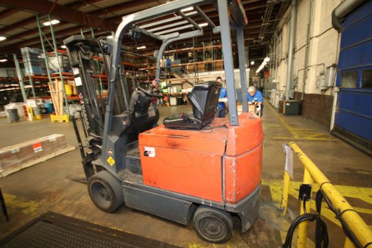2001 Toyota 5,000 lb. Capacity Electric Forklift, Model 30-7FBCU30, S/N 60091 with 3-Stage 187” H Lift, Side Shift, EE Hazardous Rating, Aprox. 8557 Hrs. (ID #VF12) includes Hobart CDAC, Model: 1200C3-18, S/N: 194CS04357, AC Input: 208/240/480v 3PH 60Hz, DC Output: 36V, Max. Amp 252, Amp Hours 1051-1200 in 8 hrs.