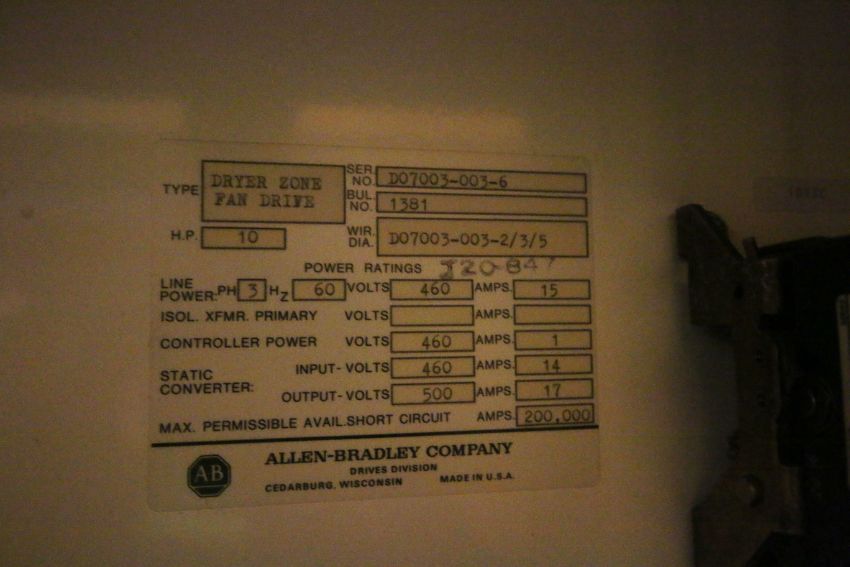 { Group of lots: 42, 45, 47, 60, 61, 62, 65, 66, 67, 68, 69, 70, 71, 72, 73, 73A, 73B, 75, 77, 79, 80, 81, 82, 83, 84, 85, 86, 97, 98, 99, 100, 101, 102, 103, 104, 105, 106, 107, 108, 109, 110, 111, 112, 113, 118, 119, 121, 134, 135, 136, 149, 151, 152, 164, 165, 200, 201, 202, 203, 212, 213, 214, 215, 216, 217, 218, 219, 220, 221, 222, 223, 246, 247, 248, 256, 257, 258, 260, 261, 263B, 267, 268, 270A, 271, 272, 273, 274, 275, 276, 277, 278, 279, 280, 281, 282, 283, 285, 286, 287, 288, 289, 290, 291, 292, 293, 294, 295, 296, 297, 301, 302, 303, 304, 307, 308, 309, 309A, 309B, 310, 310A, 314, 315, 316, 317, 319, 327, 328, 329, 344, 352, 355, 356, 357, 358, 361, 363A, 363B, 364, 443, 444, 445, 461, 462, 463, 464, 465, 466, 467, 468, 469, 610, 637, 638, 819, 819A, 820, 823, 824, 825, 826, 827, 828, 830, 831, 832, 833, 834, 835, 836, 837, 838, 839, 840, 841, 842, 843, 846, 846B, 847, 848, 849, 851, 856, 857, 858, 859, 861, 862, 863, 864, 865, 866, 870, 871, 873, 874, 875, 876, 877 } Allen Bradley 10 hp DC Drives, Bulletin 1381, 460 V, 3 Phase (Zone 1 to 4) (Located on Mezzanine) (NOTE: Wire and Condulet Not Included Outside Panel)