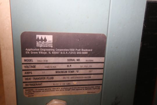{ Group of lots: 42, 45, 47, 60, 61, 62, 65, 66, 67, 68, 69, 70, 71, 72, 73, 73A, 73B, 75, 77, 79, 80, 81, 82, 83, 84, 85, 86, 97, 98, 99, 100, 101, 102, 103, 104, 105, 106, 107, 108, 109, 110, 111, 112, 113, 118, 119, 121, 134, 135, 136, 149, 151, 152, 164, 165, 200, 201, 202, 203, 212, 213, 214, 215, 216, 217, 218, 219, 220, 221, 222, 223, 246, 247, 248, 256, 257, 258, 260, 261, 263B, 267, 268, 270A, 271, 272, 273, 274, 275, 276, 277, 278, 279, 280, 281, 282, 283, 285, 286, 287, 288, 289, 290, 291, 292, 293, 294, 295, 296, 297, 301, 302, 303, 304, 307, 308, 309, 309A, 309B, 310, 310A, 314, 315, 316, 317, 319, 327, 328, 329, 344, 352, 355, 356, 357, 358, 361, 363A, 363B, 364, 443, 444, 445, 461, 462, 463, 464, 465, 466, 467, 468, 469, 610, 637, 638, 819, 819A, 820, 823, 824, 825, 826, 827, 828, 830, 831, 832, 833, 834, 835, 836, 837, 838, 839, 840, 841, 842, 843, 846, 846B, 847, 848, 849, 851, 856, 857, 858, 859, 861, 862, 863, 864, 865, 866, 870, 871, 873, 874, 875, 876, 877 } Applications Engineering Chiller, Model DSA-3CH, S/N 84G086 with 460 V, 3 Phase and R22 Refrigerant (Located on Mezzanine)