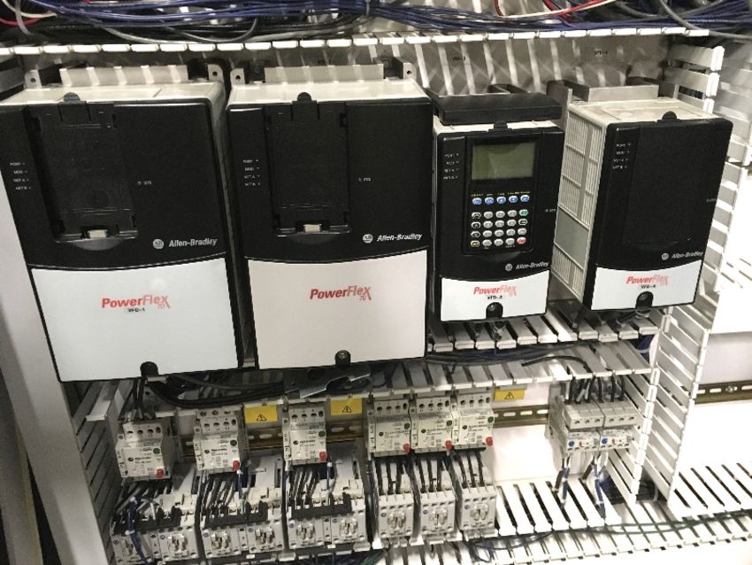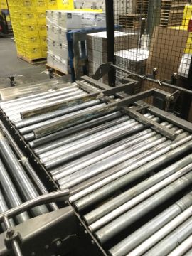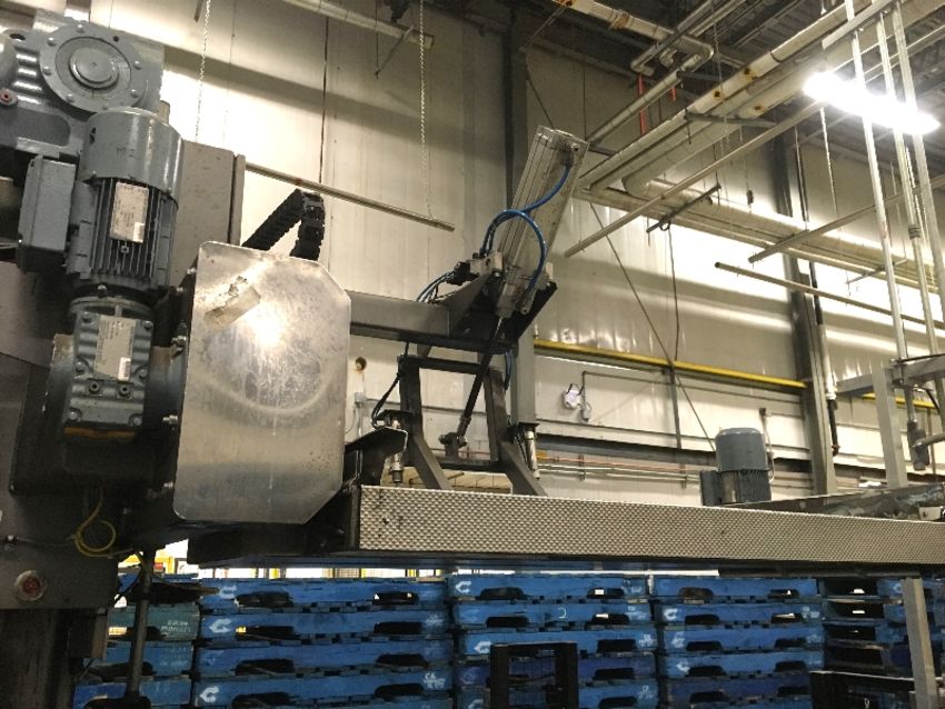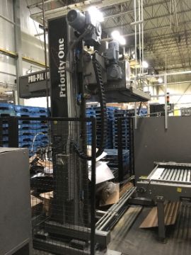 Priority One Low Level Case Palletizer Model: Mini Pro Pal Year: 2003 Low Level Infeed to Palletizer – 40 inches, Includes Pallet Dispenser, Infeed Metering Conveyor, Layer Forming Table, Fully Automatic, Designed to run RSC or Tray Shrink-wrapped Cases, Allen Bradley SLC 5/04 PLC with (4) Allen Bradley Powerflex 70 VFD Drives, Allen Bradley Panelview 600 Touch Screen for Operator Controls, Max Speed of 20 to 25 cases/minute (depending on package size), 460 Volts, 3PH, 60HZ, Last running 250mL, 500mL, 1.6L, 2.8L, 3.8L PET Bottles in Trays, Setup for 40 x 48 Pallets (Located in North Carolina)***FBEV***