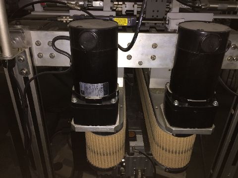 Quadrel Barcode Printer Label Applicator with Sato Barcode Printer Model 8485Se Serial $40404097, takes label and carbon ribbons - used to print and apply labels at the bottom of candy glass jars. Dual belt drives with speed controller to convey the bottles for labeling and air cylinder for pressing labels.(Located in Iowa, ***EUSA***)