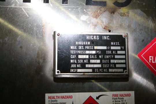 Hicks 1,725 Gal. S/S Tank, Single-Wall, S/N 844, Dims.: 60" Dia. x 146" L (Tank 2)