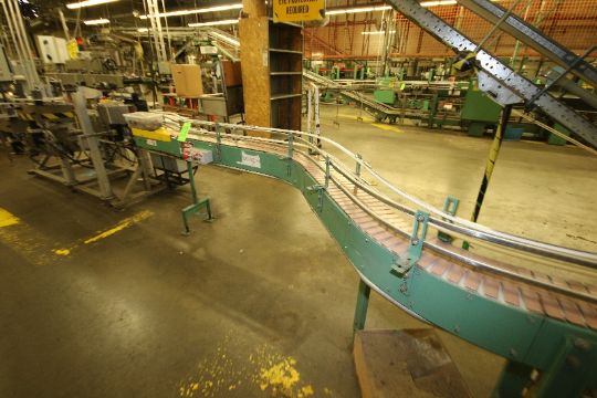 { Group of lots: 142, 143, 144, 145, 146, 147, 148, 149, 150, 151 } Aprox. 45' of Product Conveyor, with S/S Turn Table, 6" Wide Chain, with Cross Over Bridge