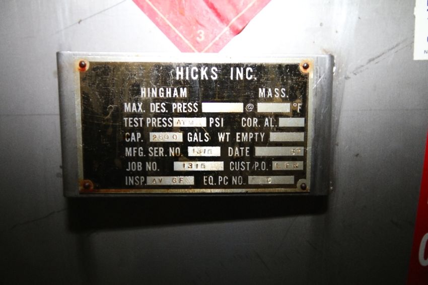 { Group of lots: 74, 75, 76, 77, 78 } Hicks 2,600 Gal. Horizontal S/S Tank, Single-Wall, S/N 1315, Dims.: 60" Dia. x 19' L (Tank 15)