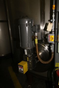 { Choice of lots: 165, 166 } JBF 10,000 Gal. Vertical S/S Tank, Single-Wall, with Baldor 3/2 hp Side Mounted Agitation, CIP Spray Ball, Drawing Available (Tank 42) (Dimensions: 138" Dia. x 14' Tall)