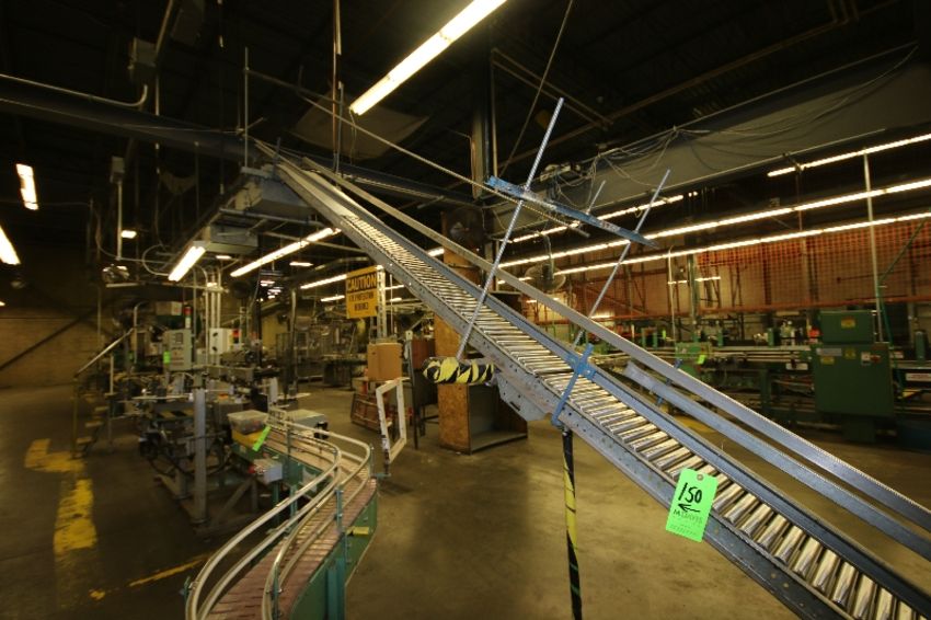 { Group of lots: 142, 143, 144, 145, 146, 147, 148, 149, 150, 151 } Aprox. 70' of Return Roller Conveyor, with Inclines/Straight Sections, Includes Power Conveyor