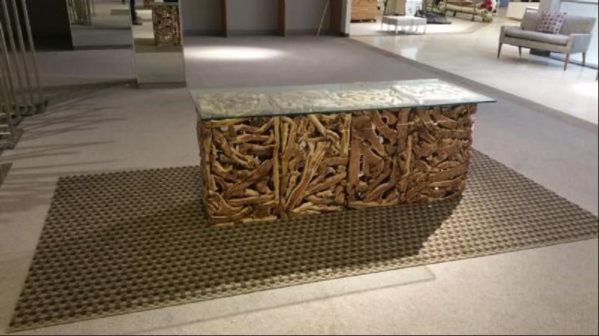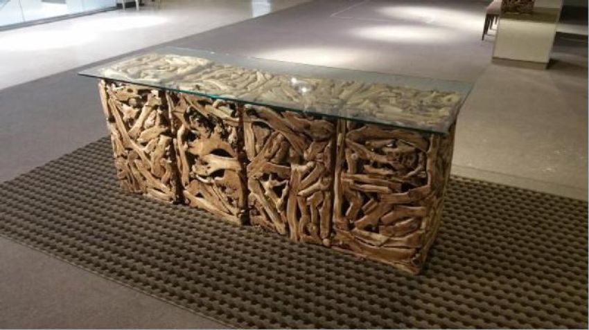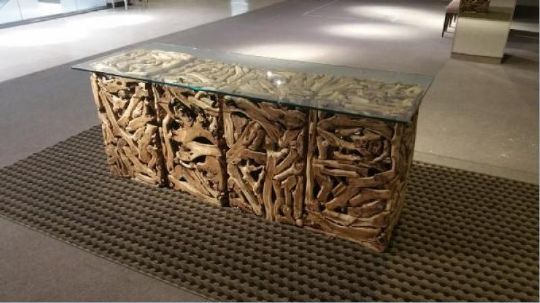 76"Lx28"Wx30.5"H Drift Wood Pedestal and Glass Table Rigging Cost: $45 There will be no rigging fees charged or collected on any hand carryable items removed by Saturday 7/29.