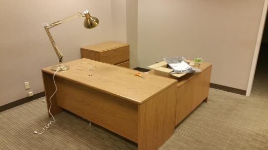 L-Shaped Desk with Matching filing Cabinet and Polished Brass Articulated Lamp Rigging Cost: $35 There will be no rigging fees charged or collected on any hand carryable items removed by Saturday 7/29.