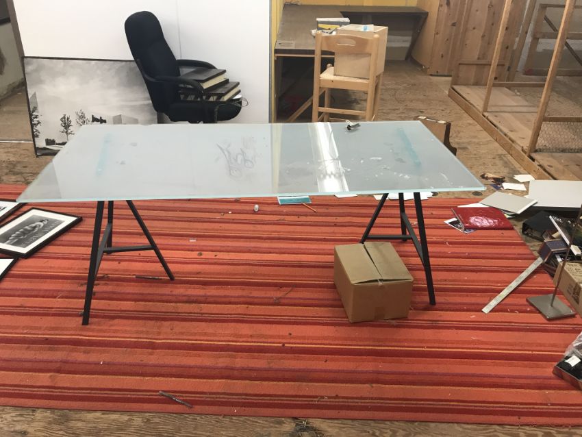 Frosted Glass with Black Metal Legs ~8' Dining Table with Red and Yellow Patterned Rug There will be no rigging fees charged or collected on any hand carryable items removed by Saturday 7/29.