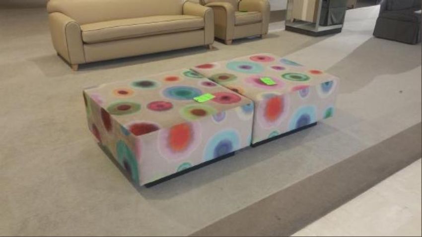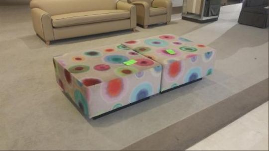 36"x36"x18" Tie Dye and Cream Fabric Wrapped Foot Rest/Bench Rigging Cost: $10 There will be no rigging fees charged or collected on any hand carryable items removed by Saturday 7/29.