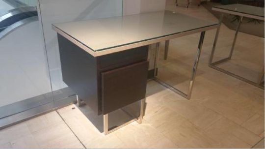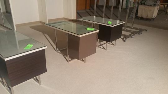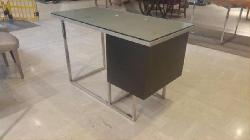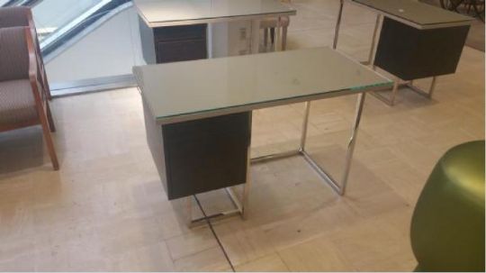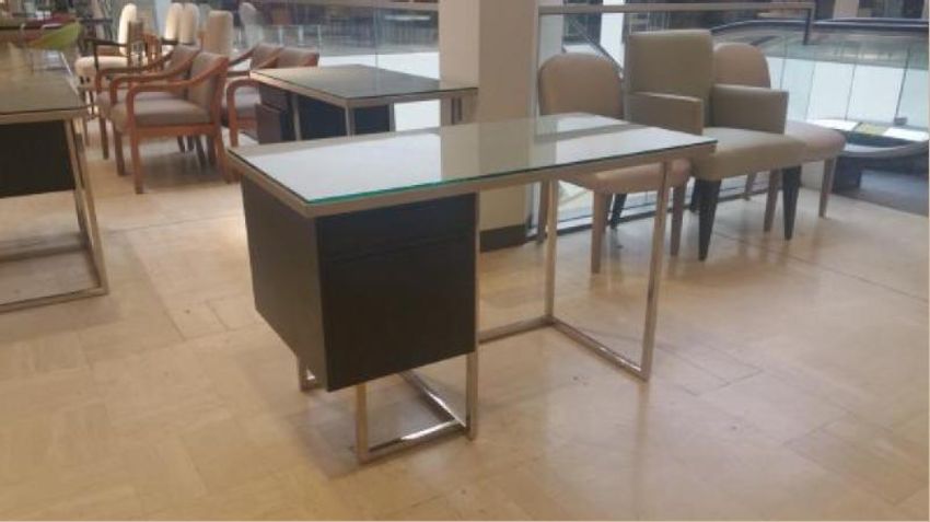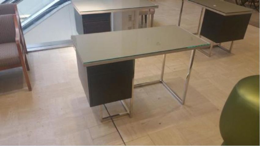 48Wx24Dx29.5H Brown/Gray Laminated Wood, Chrome Legs, Leather Wrapped Top with Glass Cover Desk with (2) Push/Clasp open shut drawers Rigging Cost: $10 There will be no rigging fees charged or collected on any hand carryable items removed by Saturday 7/29.