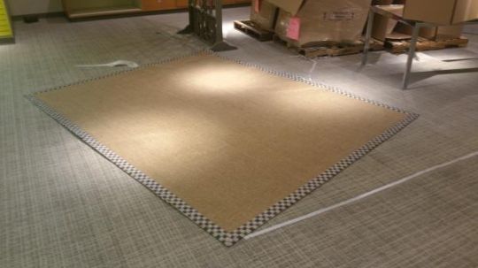 MacKenzie Childs Rug with Woven Interior and Checkered Border 8'x12' Rigging Cost: $10 There will be no rigging fees charged or collected on any hand carryable items removed by Saturday 7/29.