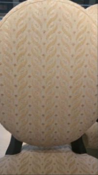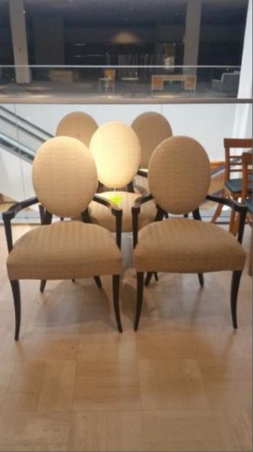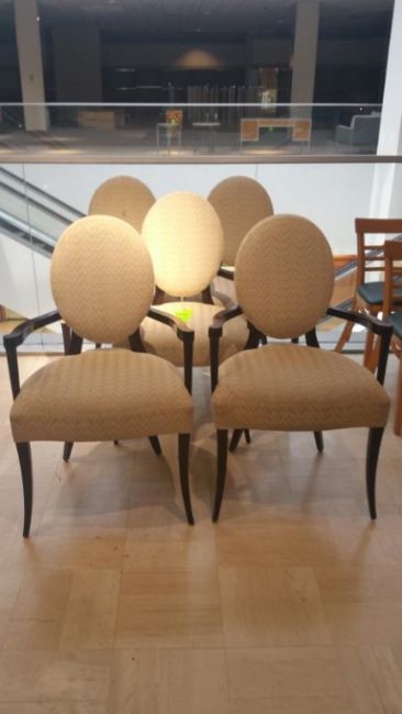 Dark Wood and Patterned Cream Fabric Captains Chairs (2) Located on 1st Floor Rigging Cost: $15 There will be no rigging fees charged or collected on any hand carryable items removed by Saturday 7/29.