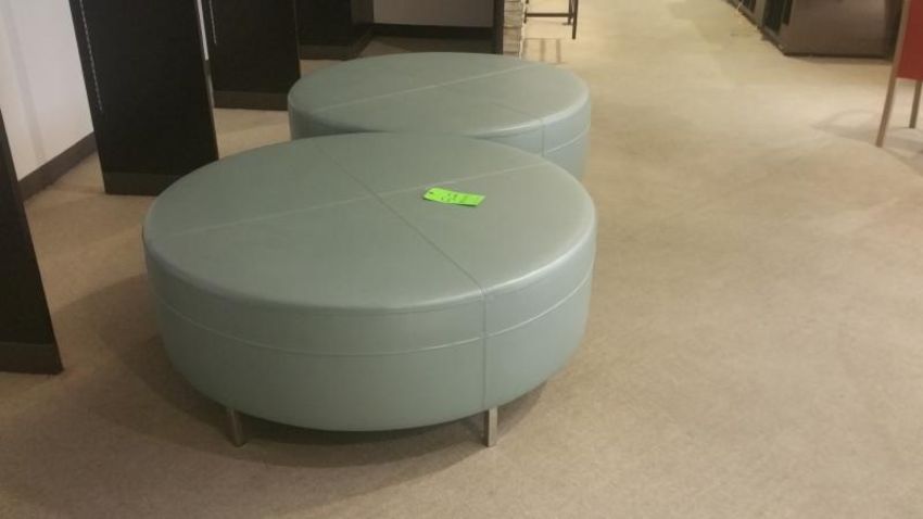 48"x18" Round Light Blue Leather Bench with Chrome Legs Rigging Cost: $15 There will be no rigging fees charged or collected on any hand carryable items removed by Saturday 7/29.