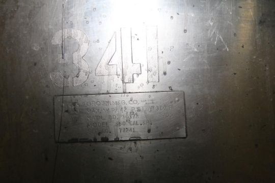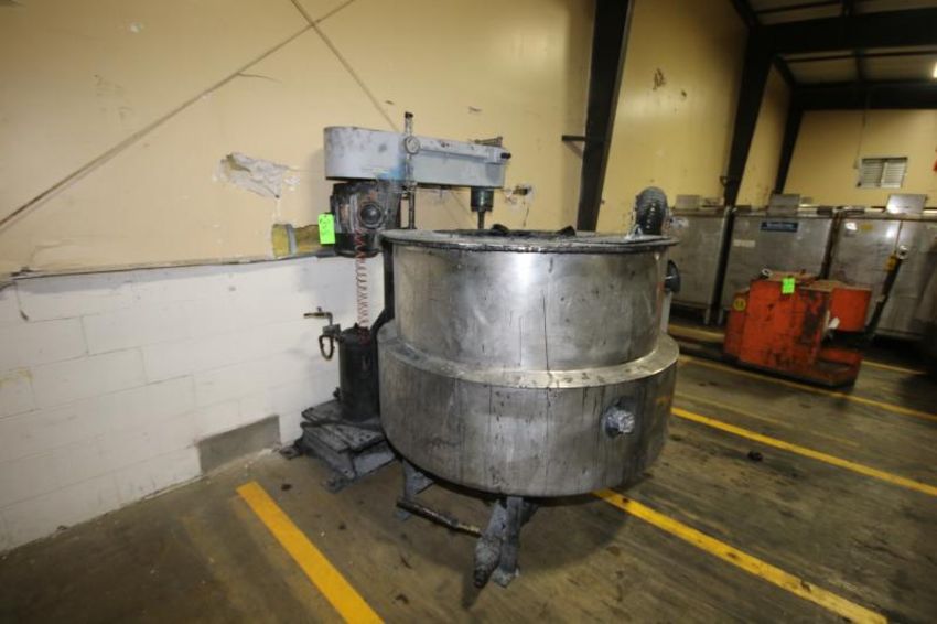 Groen 350 Gal. Jacketed Tank, S/N 77241, Max. WP- 42 PSI @ 300 F, National Board Number: 30378, with 10 hp Pedestal Mixing Arm (NOTE: Haz Rating Class 1/Div 1 Group D)