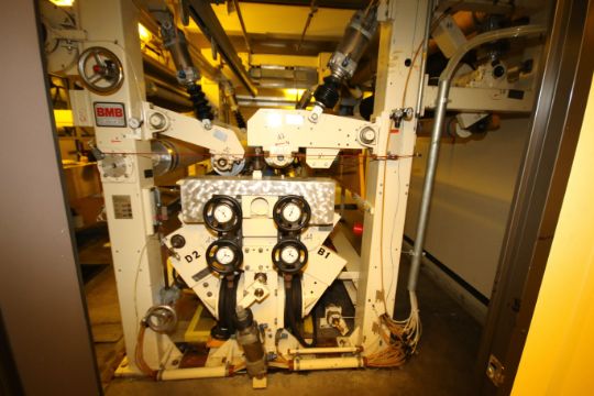 Bachofen + Meier AG Bulach (BMB) Reverse Roll Coater, S/N 15’084/87 with 68” W Roll, Drive Motor, Reverse Roll Coater, Metering Bar, Air Knife LB 3-D, Catch Pan, Vacuum Roll and Controls and includes 15 hp Vacuum Blower Located 2nd Floor Dryer Room