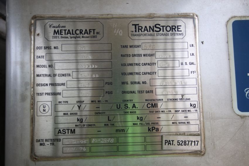 Metal Craft 470 Gal. Portable Stackage S/S Totes, Model 511719, 304 S/S with Bottom Ball Valves (2-4 no Manway cover i.e. Lid) (Seller Will Load Free of Charge on Buyer's FLAT BED Trailer. Loading Must be Scheduled in Advance)