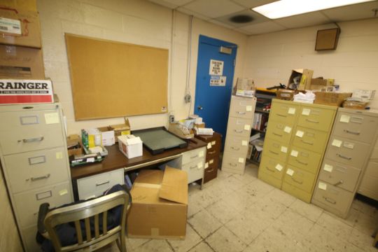 Contents of Lab Office, Includes (2) Desks, (1) Table, (6) Filing Cabinets, (2) Paper Cutting Boards, (3) Chairs, Assorted Inventory of Light Bulbs, Emergency Lights, Book Shelf, Projector, Lock Out/Tag Out Locks and Other Present Contents