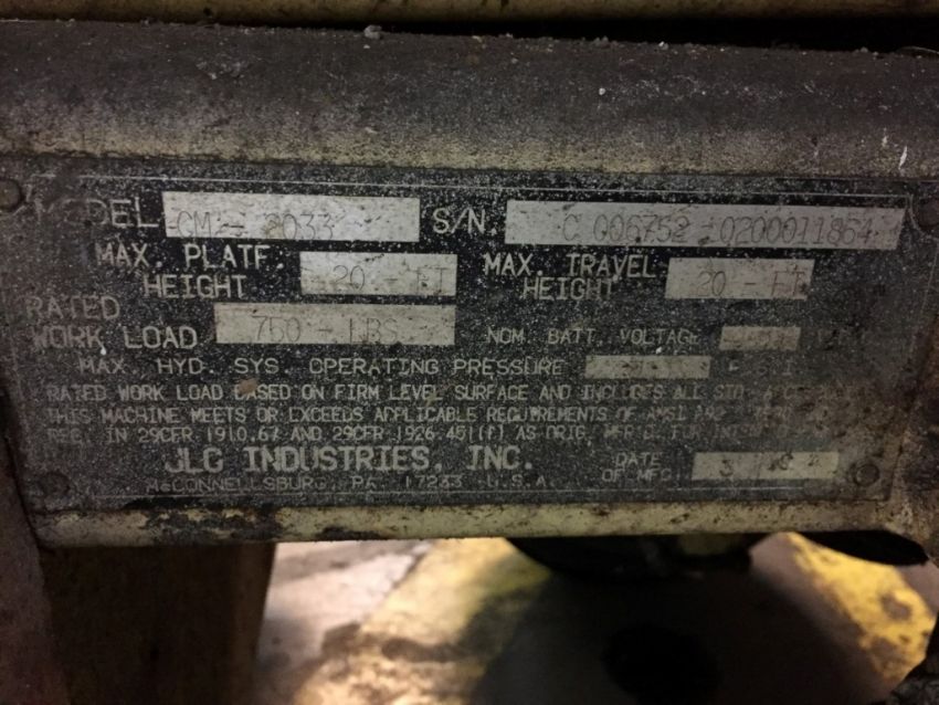 JLG Ind. Manlift Platform, Model CM-2033, S/N C00175210200011864 (Located Bridgeview, IL) ***Removal: Items must be removed by July 21