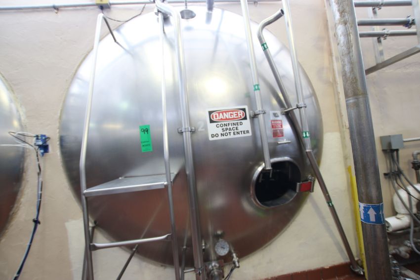{ Choice of lots: 98, 99 } Walker 4,000 Gal. Jacketed Horizontal Tank, S/S Front, Model 10593, S/N HHT4886R, 84 SQ/FT Jacket, R-12, 85 PSI Working Pressure, Tested 145 PSI, Equipped with Top-Mounted Prop Agitation, Dual CIP Spray Ball, Temperature Gauge, Tri-Clover 3" Air Valve, Sight Glass, Internal Dims.: 12’ 4” (148”) Long x 7’ 10” (94”) Dia.