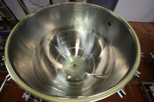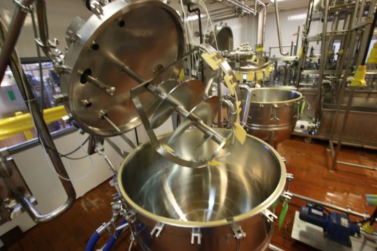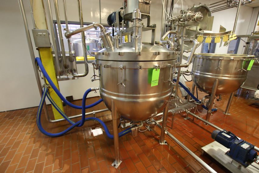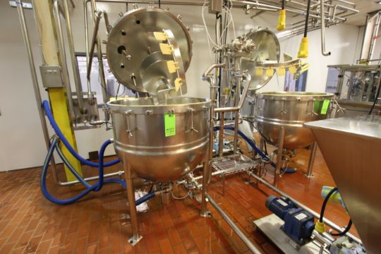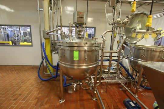 Lee Approx 100 Gallon S/S High Shear Kettle, M/N 100D9MT. S/N A7863-1, Jacket 90 PSI @ 332 F, Test Pressure 155 PSI, NAT’L BD 2961, with Sweep/Scrape Agitation, SEW 1 hp Agitation Motor, Pressure Sealed Lid, S/S Legs, Overall Dims.: 78” Tall x 62” W