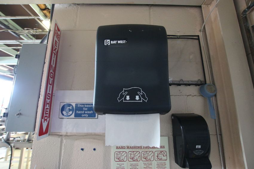 Krowne Single Bowl S/S Sink with Foot Pedals, Model HS-2 & Bay West Touchless Paper Towel Dispenser (Located on Wall Near Outfeed Conveyor & Safeline Metal Detector)