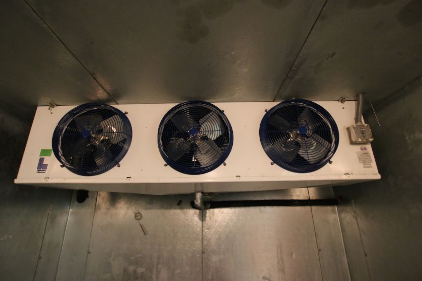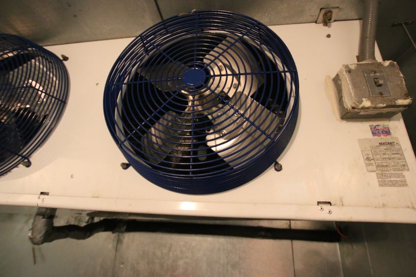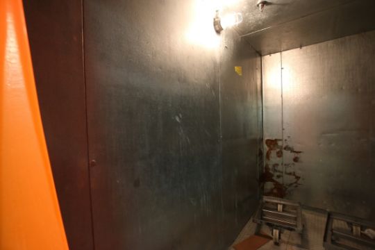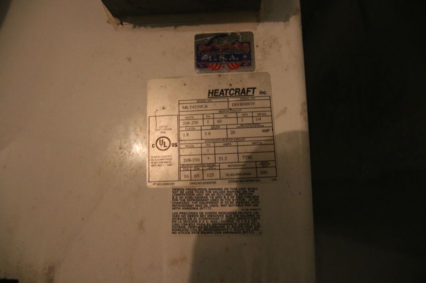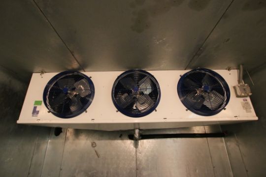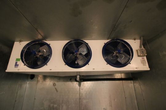 Modular Freezer Approx. 124" W x 115" L x 91" H with Larkin 3-Fan Evap Blower, Model MLT4250CA, S/N D01B00919,1/4 HP Per Fan, 208/230, 1Ph, Metal Diamond Tread Floor, Regent Insualted Modular Freezer Door S/N DO1153.3, Door Dimensions: 64" W x 84" H