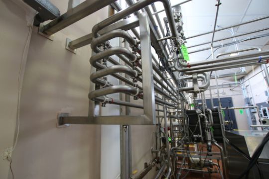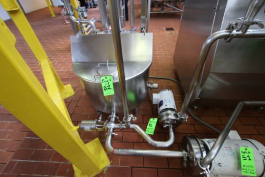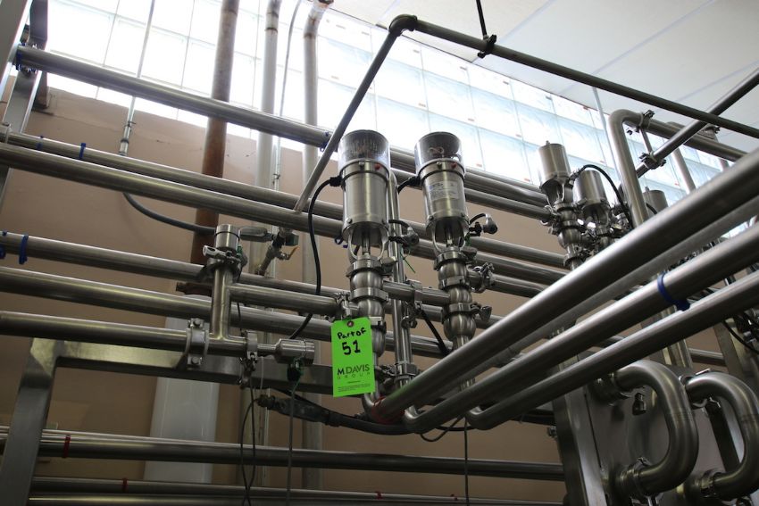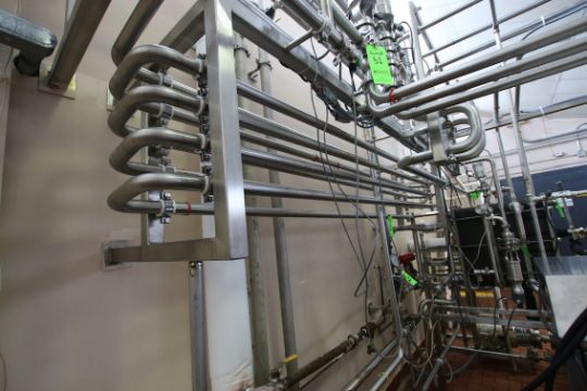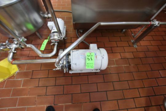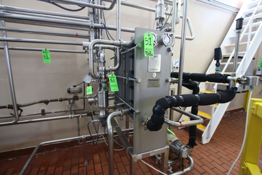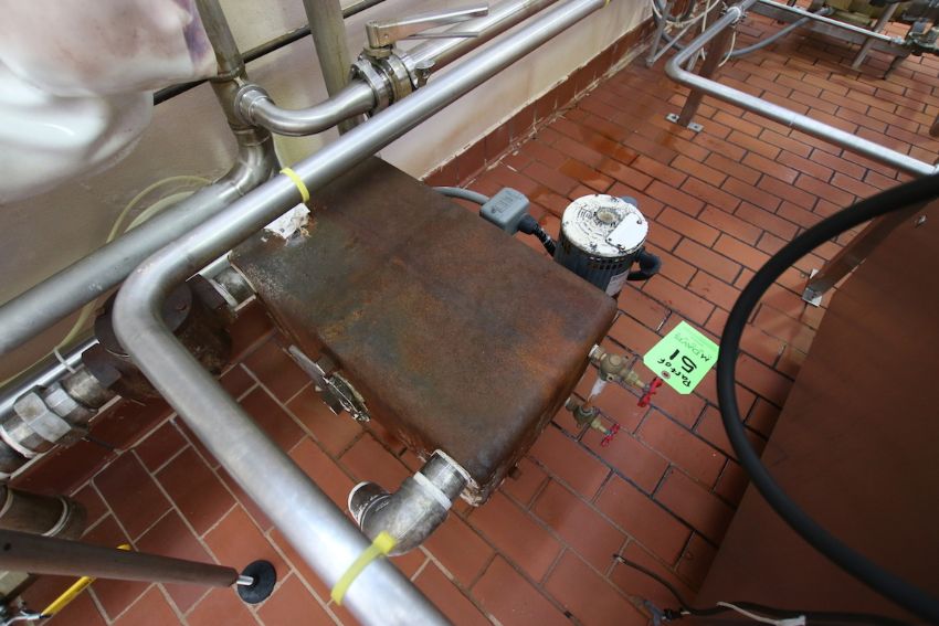{ Group of lots: 51, 52, 54, 55 } WCB S/S Plate Press, M/N T13CH-AL-1, S/N 5057, Test PSI 200, Design PSI 150, Built by UDMC, (2) Dividers, 145 Plates, Includes Flow Diversion Valve, 1-1/2” Nested Holding Tubes, (2) WCB 1-1/2 HP & 10 HP Centrifugal Pumps, (2) WCB Air Valves, Approx 50 Gallon S/S Hinged Lid Balance Tank, (5,000 LBs/Hr) (Additional Pump Descriptions: WCB 10 hp Centrifugal Pump, M/N 2085LV, S/N 384115-05, with Aprox. 1” x 2” Clamp Type S/S Head, with Baldor 3450 RPM Motor, 208-230/460 VoltsWCB 1.5 hp Centrifugal Pump, M/N 2065LV, S/N 384116-05, with Aprox. 1” x 1” Clamp Type S/S Head, with Baldor 1755 RPM Motor, 208-230/460 Volts)