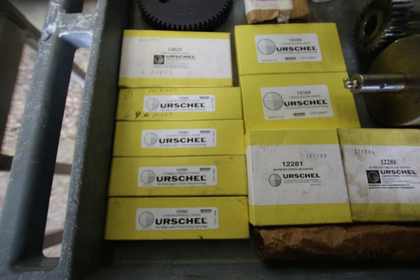 Urschel Spare and Replacement Parts Including 2-Replacement Cuttign Wheels, (10) Boxes Slicing, Cross Cut & Circular Knives, and More