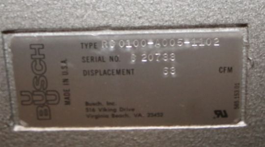 Busch Vacuum Pump, Type RC0100-A005-1102, S/N C20733, 63 CFM with Toshiba 5 hp High Efficiency Motor, 1730 RPM, 208-230/460 V, 3 Phase