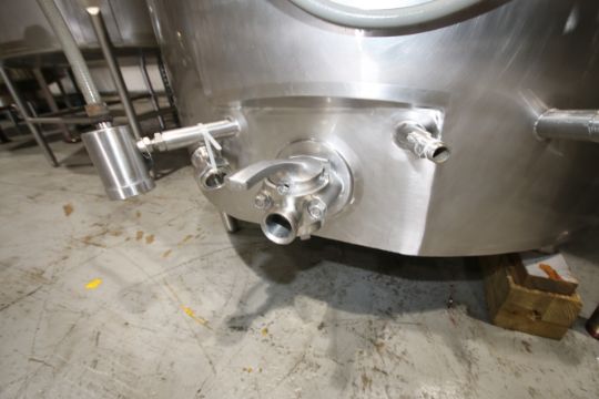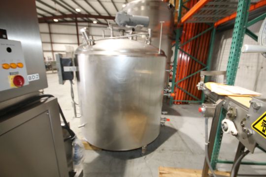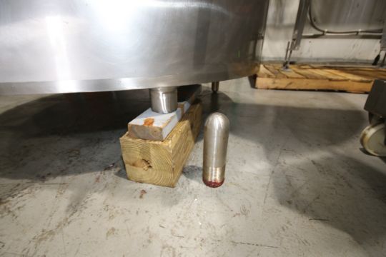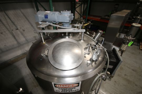 500 Gal. Dome-Top Sloped-Bottom Jacketed Processing Tank, Equipped with Top-Mount Two-Blade Wide Prop Agitation, Dual CIP Spray Balls, Side Wall Baffle, Mounted on S/S Legs, with Anderson AJ-300 Chart Recorder, Overall Dims. 91” Tall x 71” Dia. (**NOTE: Leg Needs Repaired**)