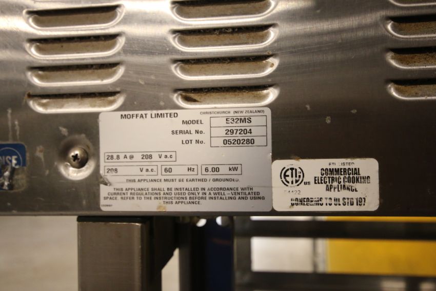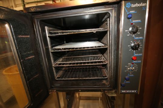 Moffat Limited 4-Shelf Commercial Electric Turbofan Portable Convection Oven, Model E32MS, S/N 297240, 208 Vac, Mounted on Tray Rack Stand