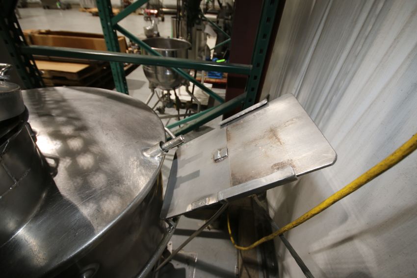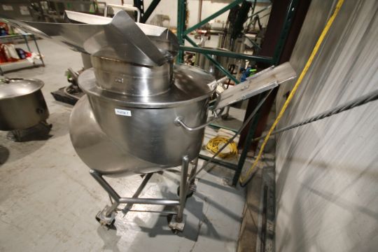 { Choice of lots: 78, 79 } } } Aprox. 60 Portable S/S Kettle, 304 S/S, Mounted on Portable Frame with Sweep/Scrape Agitation, Infeed Hopper and Lid, Dimensions Aprox. 26" W X 328" H (Kettle #2) (NOTE: Agitator Drive Motor Not Included)