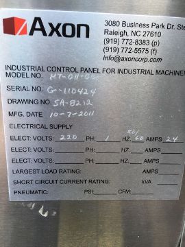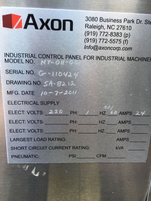 Axon EZ-130 Neck Bander or Sleeve Labeler with Heat Tunnel Serial: G-110424 Year: 2011 Stainless Steel Construction, Last placing tamper evident neck bands on containers, Allen Bradley MicroLogix 1200 PLC, Stainless Steel Axon Heat Tunnel Included, Max speed of 150 containers per minute, Film Lay flat Range of 18mm to 130mm, Container Diameter Range from 10mm to 79mm, 208 Volt, 60 Hz, 80 PSI Air Consumption(Located in North Carolina) ***FBEV***