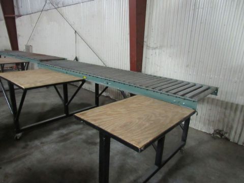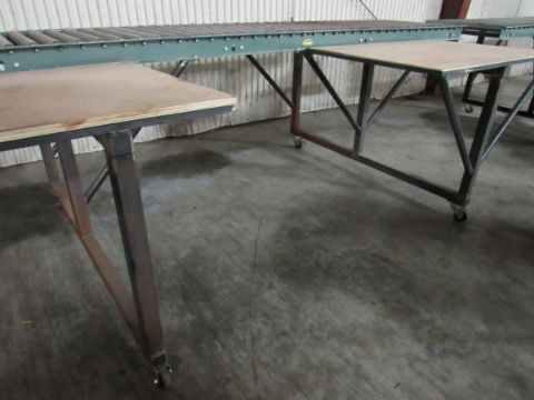 Packing Table with 10ft Hydrol Roller conveyor and two work surface with plywood tops on casters, 28" wide conveyors, work surface about 4ft wide for one and 22" wide for the 2nd one- Work surfaces of mirror image of 345 - Larger surface on the left (Rigging and loading fees included in the selling price - optional Palletizing $125.00)(Located in Iowa)***EUSA***