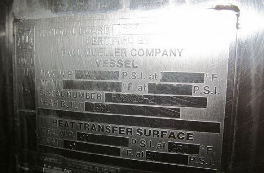 Mueller 800 Gallon Stainless Steel Jacketed Processing Tank S/N: F39026-2 Jacketed Processor, last used in food production plant, Dish Head, Dish Bottom, 90 PSI, 250 Deg F, Vertical Agitator, 55? Diameter x 127? Height, CIP Spray ball(Located in North Carolina) ***FBEV***