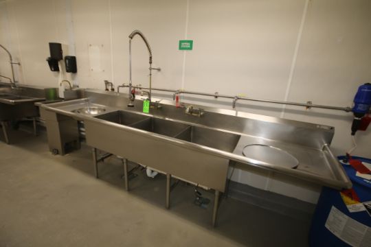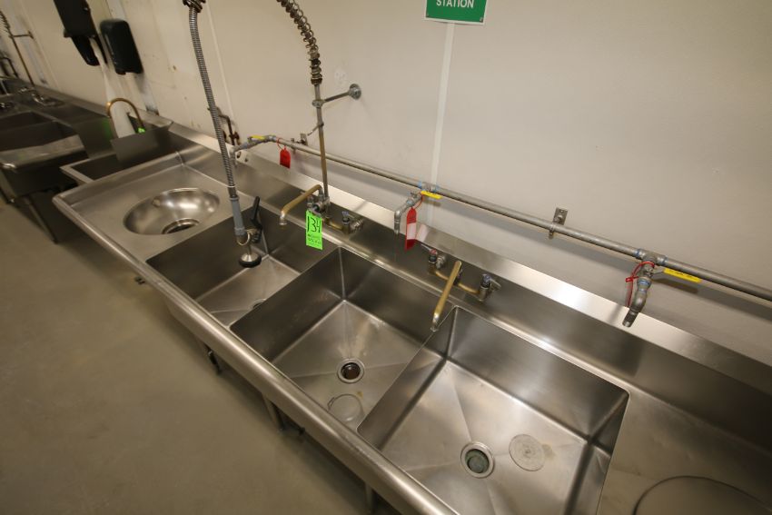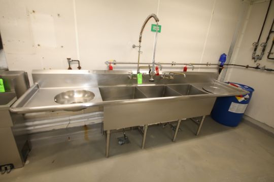 S/S 3-Compartment Sink, with Spray Nozzel, and (2) S/S Attached Staging Areas, Overall Dims.: Aprox. 135" L x 29" W x 45" H