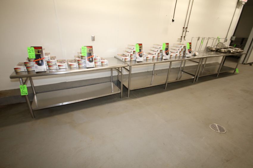 { Choice of lots: 48C (P) } } } } } } S/S Tables, All with S/S Bottom Shelves, Dims.: 72" L x 29" W x 31" H; 96" L x 30" W x 32" H; 96" L x 30" W x 32" H