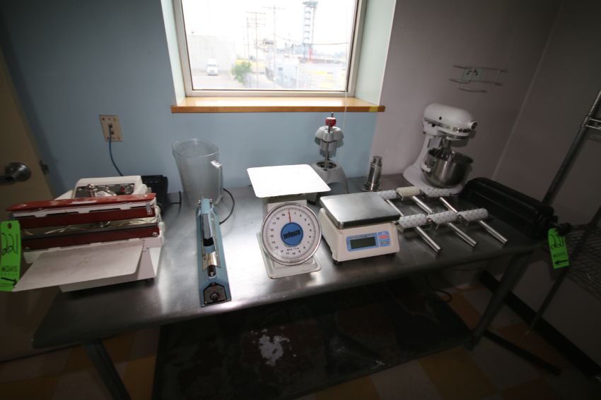 Contents of Table Top, Inlcudes (2) Scales, (2) Sealers, (1) Knife Sharpening Station, (6) Scoring Rolls, (1) KitchenAid Mixer, and Other Present Contents