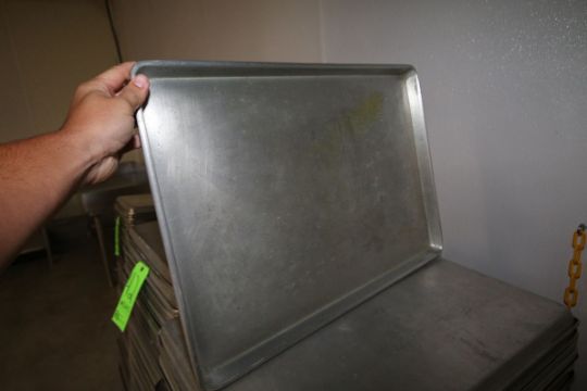 { Choice of lots: 41, 42, 43 (P) } } } } } } S/S Pans, with S/S Mobile Cart with Side Rails, Pan Dims.: Aprox. 24" L x 17" W