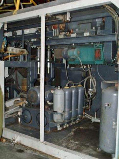 1992 Techne Blow Molder, Model #20000, Capacity - 20-Liters (5-Gallon) Single Cavity, Or Dual 10-Liter (2.5-Gallon), S/N 18208, Dual 330-mm PE Processing Head, Max Head Tooling 7”, 90-mm 24:1 Air Cooled Extruder, Continuous Extrusion, 700#/Hr. Output, 125-Hp. DC Extruder Drive Motor, 40-Hp. Hydraulic Motor, In Machine Trim, Barber Colman Maco 6500 Series Controls Installed 2004,200-Point Parison Programming, Platen: 24” x 24”, Ladder & Platform, All Manuals, Not Under Power.
