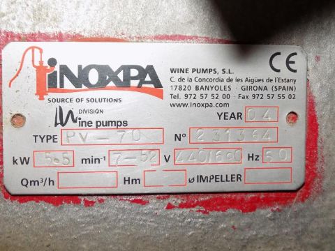 2004 Inoxpa 5.5 kw Pump, Type: PV-70 EUR 50.00 Euro Rigging & Loading Fee. Additional Packaging Fees May Apply)
