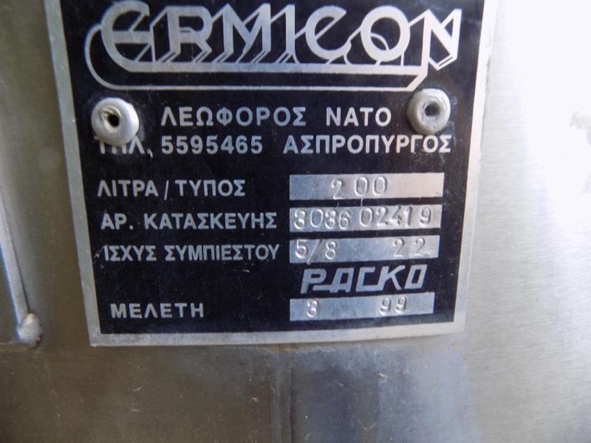 Ermicon (Packo) Aprox. 200L/52 Gal. S/S Jacketed Farm Tank with Hinged Lid, Twin Blade Prop, Motor with Freon Condenser and Control Unit, DIN 40 (NOTE: Condenser Cover Broken) ( 50.00 Euro Rigging & Loading Fee. Additional Packaging Fees May Apply)