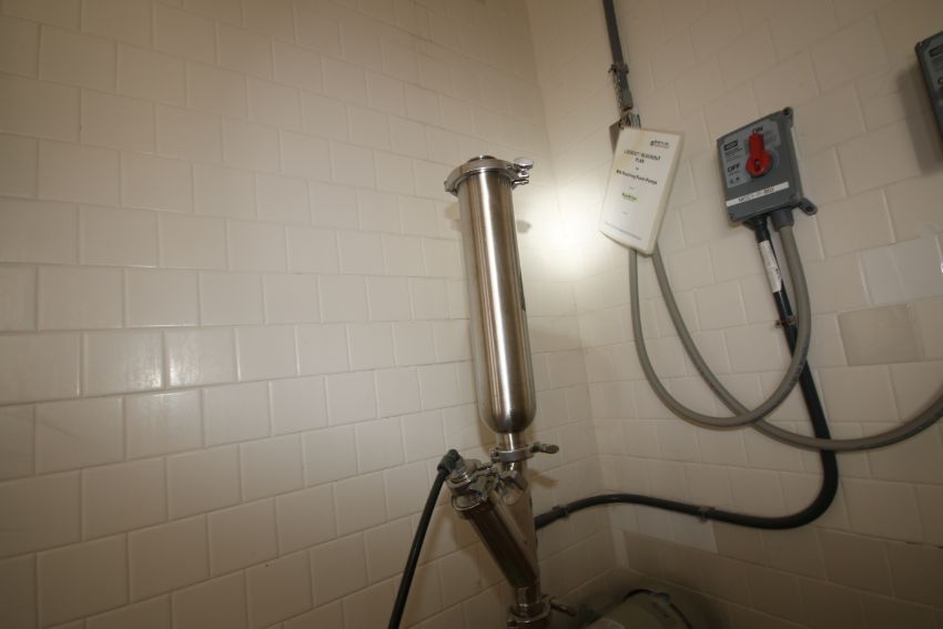 Fristam 5 hp Cent. Pump, Model FPR3541, with 3″ x 2 1/2″ CT S/S Head, Includes TC 2″ CT x 17″ L SS Online Filter with Check Valve (LOCATED IN SILOS ALCOVE)